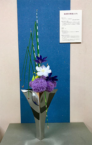 花形を決める際に森先生から頂いた助言は花席の配置を考慮することでした。会場入口からは、池坊らしさが際立つ立花正風体と生花正風体の花席が続き、最初の角を左に曲った場所に3席だけ設けられた場所であり、続く花席は映画『花戦さ』との連動企画展示です。したがって、「池坊らしさを保持しつつもモダンな自由花にするのがよいでしょう」という助言だったのです。当初は知人に貸して頂いた年季物の竹器に生花正風体で季節感のある花材をいけようと考えていたのですが、ここは素直に助言に従うことにして、ステンレスの花器を選択しました。花展まで2回ほど習作をする機会があって花材と全体構成も絞り込まれていき、最終的には「鉄線」を用いることに決まりました。