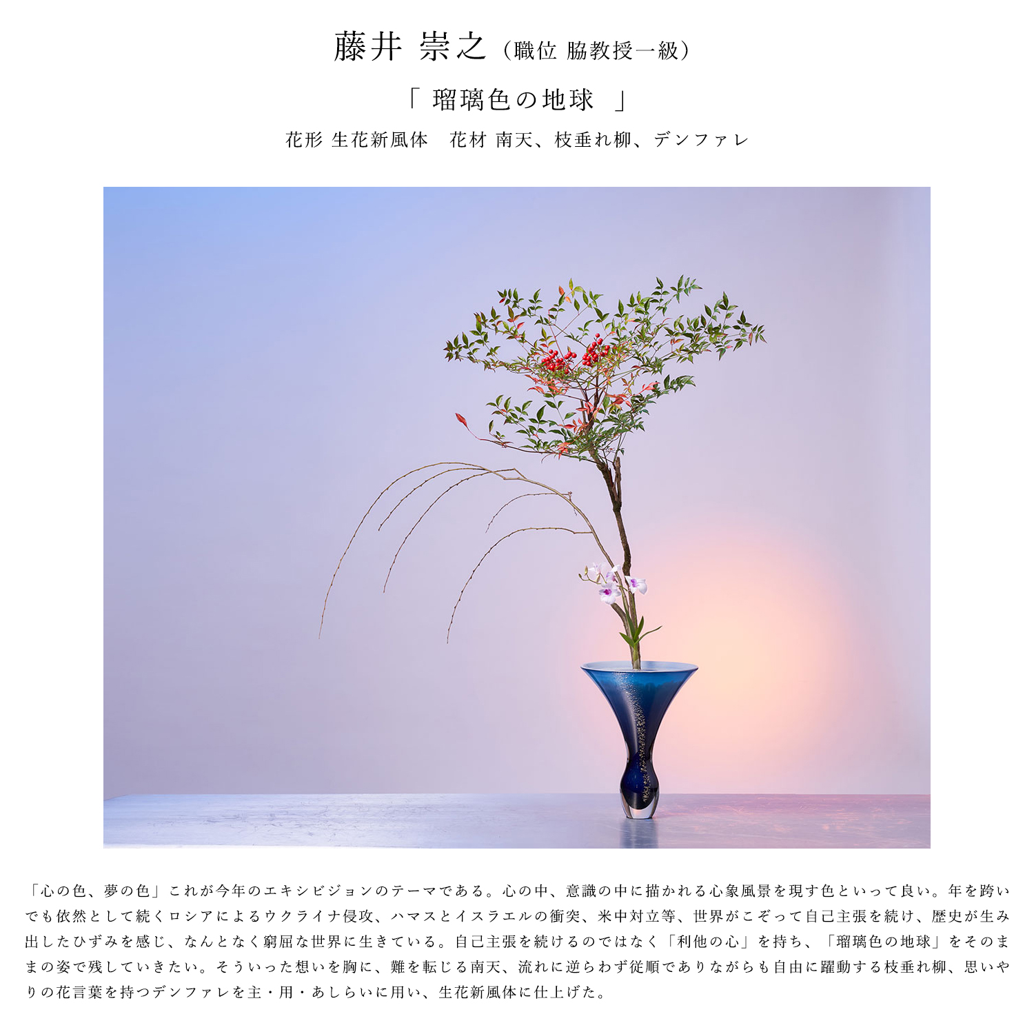 大きな会場での始めての出瓶となりましたが、不思議と緊張はありませんでした。仕事でお客様のために日々考えを巡らせ実践することと、”いけばな”の練習を重ね花展で実践することが似ていたのかもしれません。“いけばな”はビジネスと同様、決断の連続です。この緊張感を楽しみながら、引き続き精進していきたいと思います。